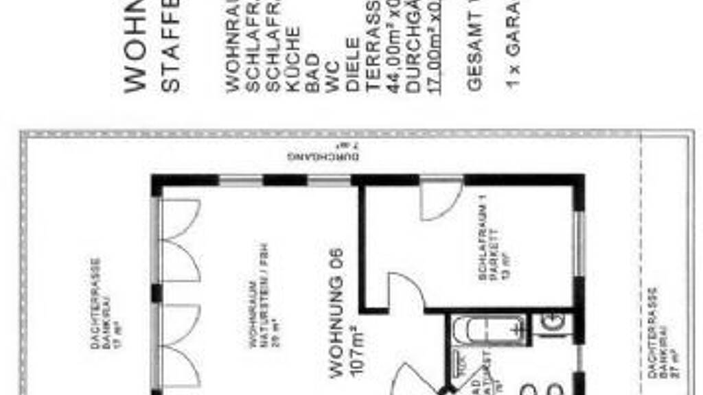 Die Wohnung liegt im Staffelgeschoss und hat eine Größe von 107,00 m². Die Wohnung ist sehr großzügig geschnitten und besteht aus einem Wohnraum mit ca. 29 m² und einer sich anschließenden offene Küche von 15 m², weiterhin 2 Schlafzimmer, das Wannenbad und ein Gäste-WC.