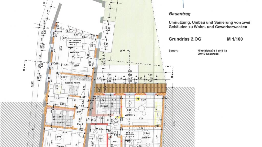 Starten wir die Beschreibung in der Chüdenstraße 2, dem Fachwerkhaus. Hier finden Sie ein teilweise unterkellertes Gebäude vor. Die Kellerdecken habe eine geringe Höhe von 1,70 m bis 2,0 m, sie bestehen aus Holzbalken mit ausgemauerten Gewölben. Das Kellergeschoß ist mit dem benachbarten Speicher in der Nikolaistraße 1A verbunden. Schmuckvolle Außenwände bestehen aus Mauerwerkswänden/Fachwerkwänden mit gemauerten Gefachen, die Fachwerkwände sind innen mit Lehmschlag versehen oder teilweise als Trockenbauwände erstellt. Der Dachstuhl ist als Pfetten- bzw. Kehlbalkendach erstellt und neu eingedeckt worden. Die Fenster wurden größtenteils durch weiße Holzfenster, im zum Haus passenden Stil, erneuert. Alle Zimmerdecken sind aus Holz gefertigt. Im Erdgeschoß befindet sich der Gewerbebereich, durch die Ecklage eine tolle Lage für Gewerbetreibende. Betreten werden kann die Einheit durch einen Vorder- und einen Garteneingang. Ideal für Unternehmen die einen Außenbereich benötigen. Zur Zeit besteht folgende Aufteilung: vier sehr großzügige, teilweise miteinander verbundene Räume, einem Raum mit Anschlüssen für eine Gastroküche, einem großen Eingangsbereich und zwei WCs. Eine Teilung in zwei Gewerbeeinheiten wäre durchaus möglich. Die Gesamtfläche beträgt hier ca. 174 m² und könnte durch 2 weitere Räume im Zwischengeschoß auf ca. 204 m² erweitert werden. Über den hofseitig gelegenen Eingang betreten Sie den Eingangsbereich mit Zugang zu der Gewerbeeinheit und mit der Treppe in das Zwischen- und das Obergeschoß. Die zwei miteinander verbundenen Räume im Zwischengeschoß verfügen über einen Wasseranschluss. Im Obergeschoß befinden sich drei durch einen Flur getrennte Wohneinheiten mit jeweils zwei Räumen und entsprechenden Bädern. Küchenbereiche müssten geschaffen werden. Nicht mehr zeitgemäß erscheint die bisherige Nutzung einer Gemeinschaftsküche in den Räumen des Zwischengeschoßes. Die Größe des Obergeschosses und des Zwischengeschosses beträgt ca. 226 m² Wohn/Nutzfläche. Der Dachboden dient ausschließlich zu Lagerzwecken. Eine Verbindung zum Speicher könnte auch hier, wie im Kellergeschoß, realisiert werden. Der Zustand der Wohnung und der Gewerbeeinheit ist als sanierungsbedürftig einzustufen. Die gesamt Wohn/Nutzfläche in der Chüdenstraße 2 beträgt ca. 399 m².