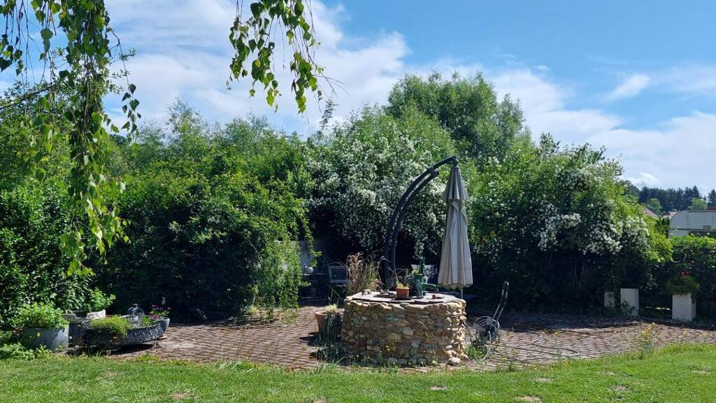 Der liebevoll gestaltete Garten, der auch vom Keller aus zugänglich ist, bietet einen Brunnen, einen überdachten Sitzplatz sowie Strom- und Wasseranschlüsse. Hier wachsen Weintrauben, Birken, Rosen, Jasmin, Pfingstrosen, Ahorn und Bauernhortensien. Ein Rasenroboter sorgt für einen stets gepflegten Rasen, was dem Garten einen parkähnlichen Charakter verleiht.