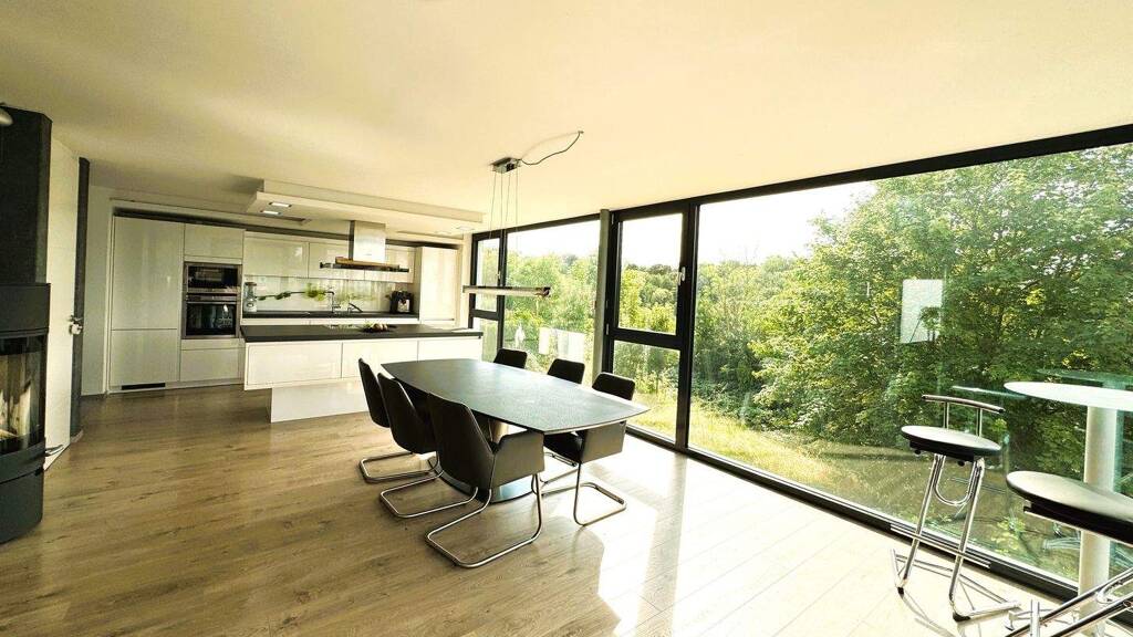 Bereits beim Eintritt öffnet sich ein architektonisch beeindruckender Eingangsbereich, der harmonisch in den weitläufigen Wohn- und Essbereich übergeht. Die raumhohen Fenster entlang der gesamten Südseite schenken nicht nur ein Maximum an Tageslicht, sondern öffnen den Blick in die Natur - ein Wohngefühl, das Freiheit und Ruhe ausstrahlt.