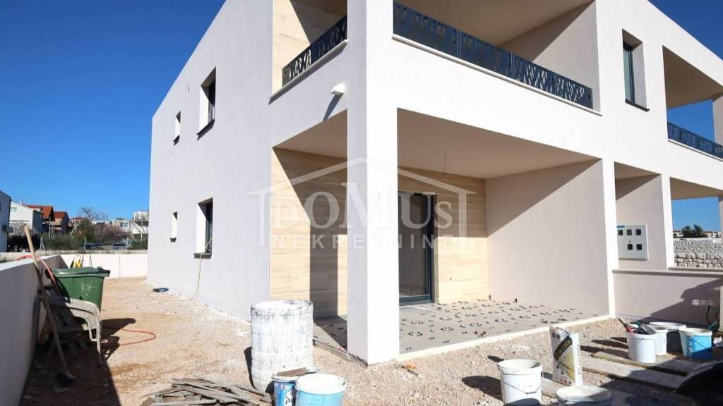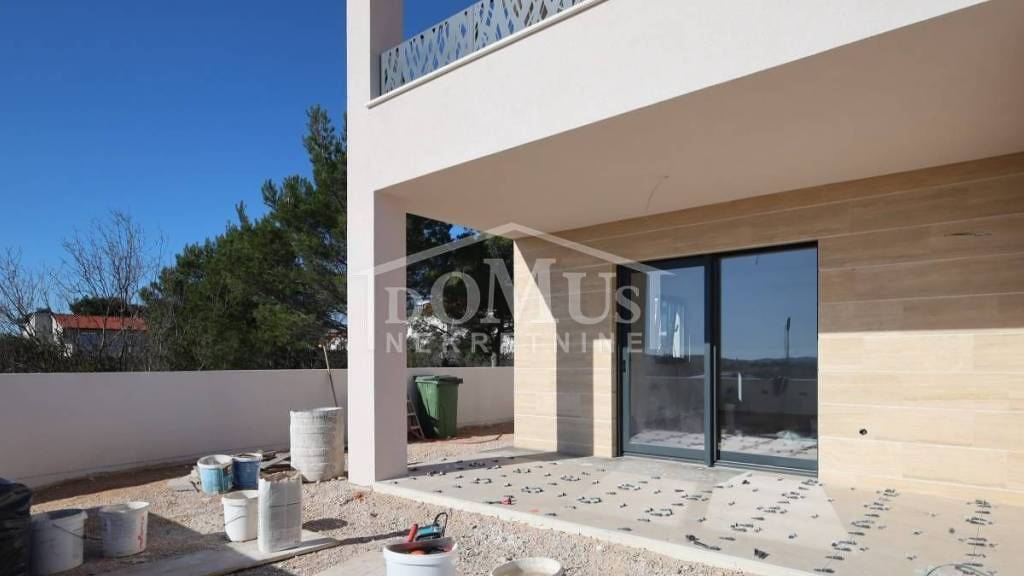 Neubau - eine komfortable Wohnung S1 mit funktionaler Raumaufteilung im Erdgeschoss eines kleineren Wohngebäudes mit insgesamt 4 Wohneinheiten. Die Wohnung hat eine gesamte Nutzfläche von 81 m² und besteht aus einem Eingangsbereich, einem Badezimmer, zwei Schlafzimmern, einem Wohnzimmer mit Küche und Essbereich mit Zugang zu einer überdachten Terrasse von 11,34 m² sowie einem privaten Garten mit einer Fläche von 103 m². Moderne und hochwertige Ausstattung: Klimaanlagen im Wohnzimmer und in allen Schlafzimmern, Fußbodenheizung (im Wohnzimmer, Eingangsbereich und Badezimmer), Fenster mit integrierten elektrischen Rollläden, Insektenschutzgitter sowie eine einbruchhemmende Eingangstür. Zur Wohnung gehören zwei Parkplätze. Die Immobilie befindet sich 1.200 m vom Meer und vom Ortszentrum entfernt.