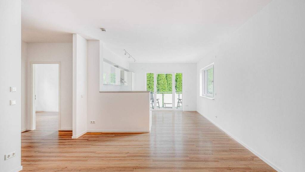 Das Herzstück der Wohnung bildet der weitläufige Wohnbereich, der mit edlem Bodenbelag versehen ist. Von hier aus gelangen Sie direkt auf den Südwest-Balkon - ein idealer Platz zum Entspannen oder um den Sonnenuntergang zu genießen. Der Außenbereich ist stilvoll gestaltet und bietet einen schönen Blick ins Grüne.