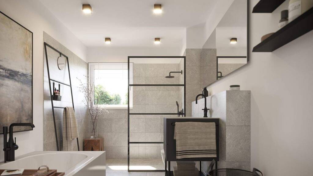 Diese in etwa 130 m² große Doppelhaushälfte, besticht durch moderne und gehobene Ausstattung. Sie bietet fünf Zimmer, darunter drei Schlafzimmer und ein Studio, das als Büro oder weiteres Schlafzimmer genutzt werden kann. Sowohl Familien, als auch Paaren bietet sich deshalb ausreichend Platz. Das großzügige Badezimmer ist mit einer Badewanne, einer separaten Dusche und einem Fenster ausgestattet. Im Erdgeschoss befindet sich ein Gäste-WC.