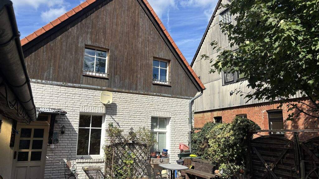 Wohnhaus mit Nebengebäude, Garage, Holzschuppen und geschlossenen Innenhof.