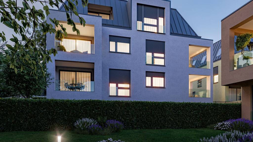 Die Kombination aus Privatgärten, sonnigen Terrassen und Balkonen schafft ein Ambiente, das urbanes Wohnen und naturnahen Rückzug miteinander verbindet.