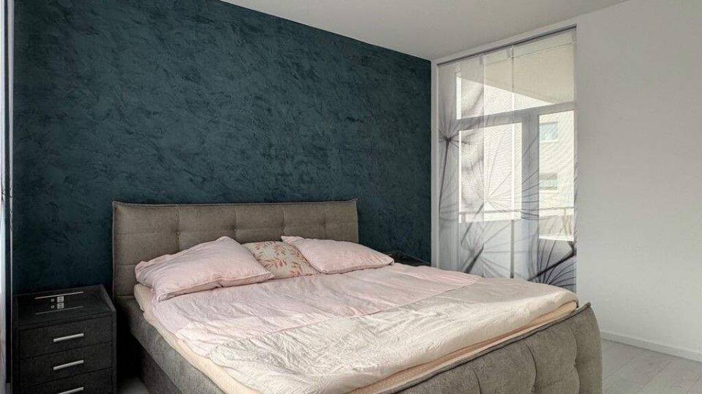 Das Schlafzimmer ist mit einem komfortablen Doppelbett und einem großzügigen Kleiderschrank ausgestattet – ideal für erholsame Nächte und ausreichend Stauraum. Das moderne Duschbad präsentiert sich elegant und gepflegt.
