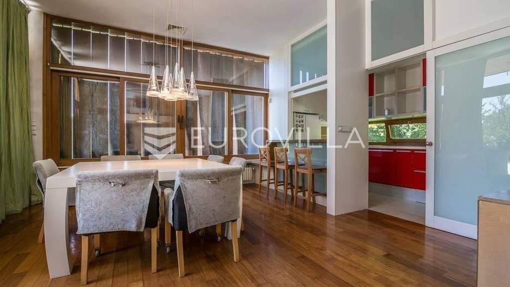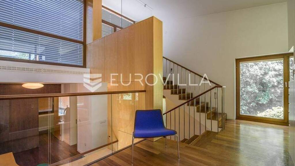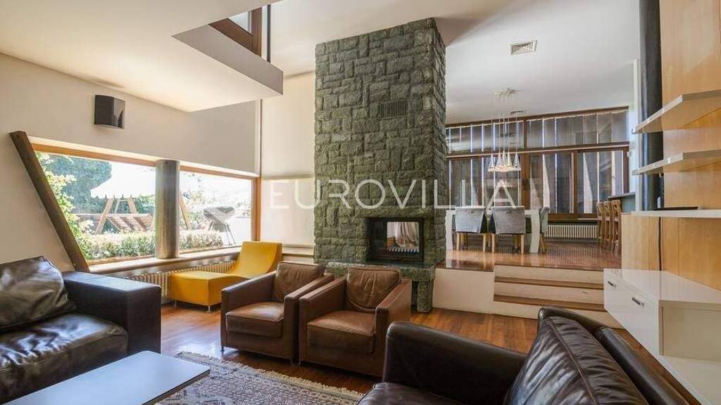 Tuskanac obiteljska vila 550 m2, bivak (biljar, kartanje, rostilj) 50 m2, zemljiste/vocnjak 8.000 m2, garaza za 3 automobila, parking za 6 automobila.Vrhunski komfor u slikovitom prirodnom okruzenju Cmroka, Umjesto tradicionalne podjele vila je organizirana u niz cjelina povezanih u obliku horizontalnog i vertikalnog meandra. Ulazni dio povezan s garazom, sobom za goste, toaletom i tus kabinom, prostor za djecu, boravak i spavaci dio, medusobno se preklapaju ostavljajuci slobodan prostor u sredini kuce.Sredisnje stepenice oblozene plemenitim drvom, staklene ograde, vrhunska rasvjeta, kamin i drva koje prolaze kroz cijelu kucu daju poseban sarm.Prekrasan pogled na okolno zelenilo, sume, vocnjak, zivice, travnjak. U samom prizemlju, okrenutom prema zapadu nalazi se bazen sa svom tehnikom, sauna, trim, gospodarstvo. Suncaliste ispred bazena. Vocnjaka s jabukama, tresnjama, kruskama, orasima, dinjom, sljivama te grmovima s malinama, kupinama, brusnicama.... Vise na eurovilla.hr, ID: 743897