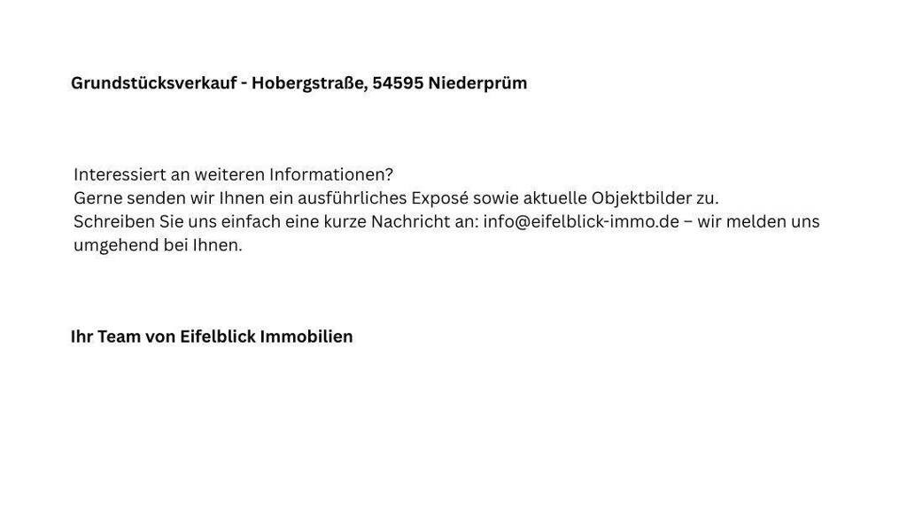 Das Grundstück in der Hobergstraße in Niederprüm befindet sich in einer attraktiven, ruhigen Wohnlage am Ortsrand von Prüm. Niederprüm ist ein beliebter Stadtteil der Stadt Prüm und überzeugt durch seine angenehme Mischung aus naturnahem Wohnen und städtischer Nähe. Das Zentrum von Prüm mit zahlreichen Einkaufsmöglichkeiten, Restaurants, Ärzten und dem Krankenhaus ist in wenigen Minuten erreichbar.