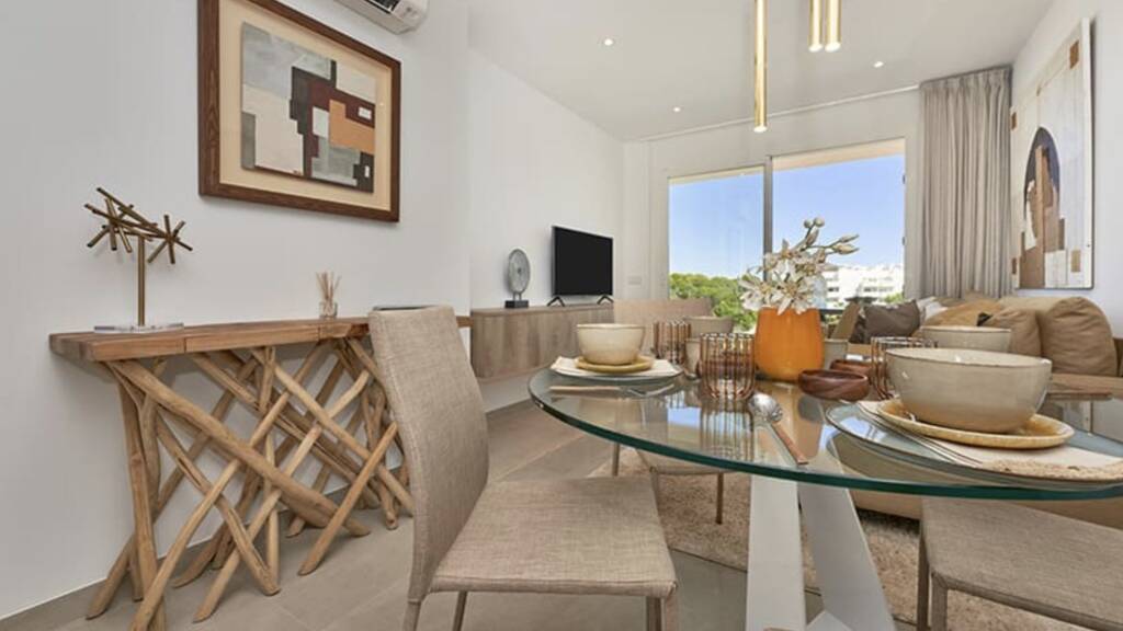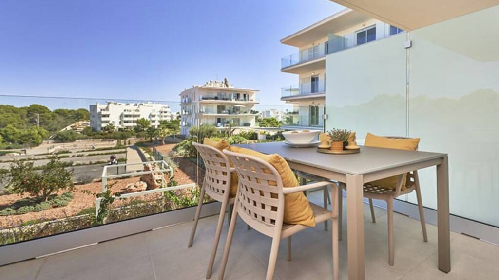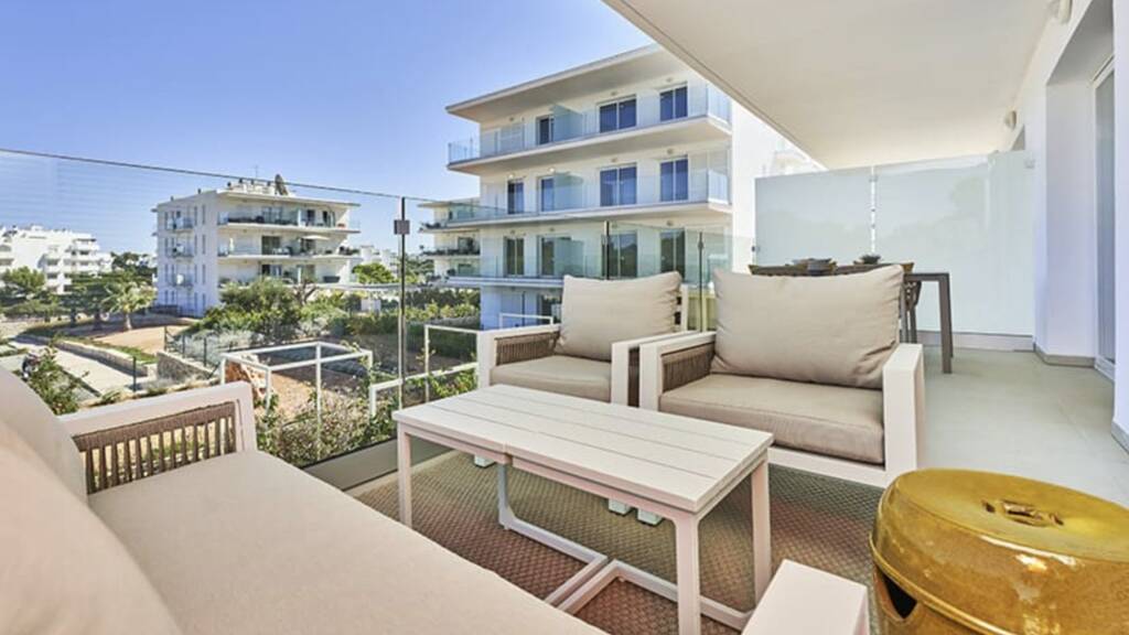 Die Wohnanlage besticht durch ihre typisch mediterrane Gestaltung in strahlendem Weiß, großzügige grüne Außenanlage mit mediterraner Bepflanzung. Ebenso stehen zwei einladende Gemeinschaftspools, einer mit einer Länge von 25 Metern, die zum Entspannen unter der mallorquinischen Sonne einladen.