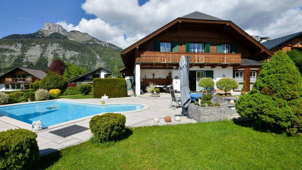 Der Außenbereich dieser besonderen Liegenschaft überzeugt auf ganzer Linie: Ein weitläufiger, liebevoll gepflegter Garten, ein stilvoll integrierter Pool und eine großzügige Sonnenterrasse mit freiem Blick auf das Dachsteinmassiv machen jede Jahreszeit zum Erlebnis. Ob entspannte Sommertage im Freien oder ruhige Winterabende mit Bergblick - hier wird Wohnen zur Lebenskunst.