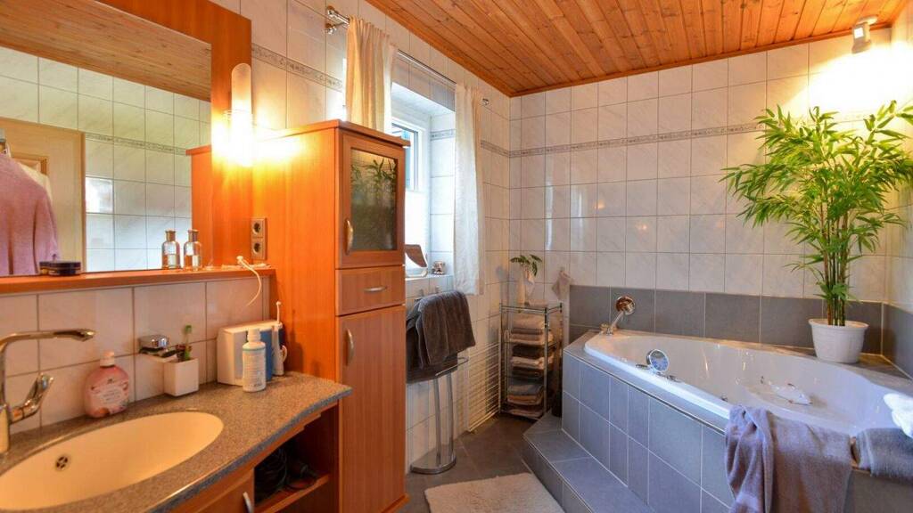 Ein besonderes Highlight ist der hauseigene Wellnessbereich: Eine Sauna, eine Whirlpool-Badewanne und eine komfortable Dusche verwandeln diesen Bereich in eine private Wohlfühloase. Abgerundet wird das Kellergeschoss durch ein separates WC sowie einen großen Lagerraum mit vielfältigen Nutzungsmöglichkeiten.