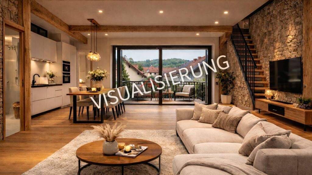 Die Raumstruktur ist als offenes Loftkonzept mit Galerieebene geplant. Die vorhandene Dachkonstruktion mit sichtbaren Holzbalken sowie die großzügigen Raumhöhen verleihen der Wohnung eine außergewöhnliche Wohnatmosphäre.