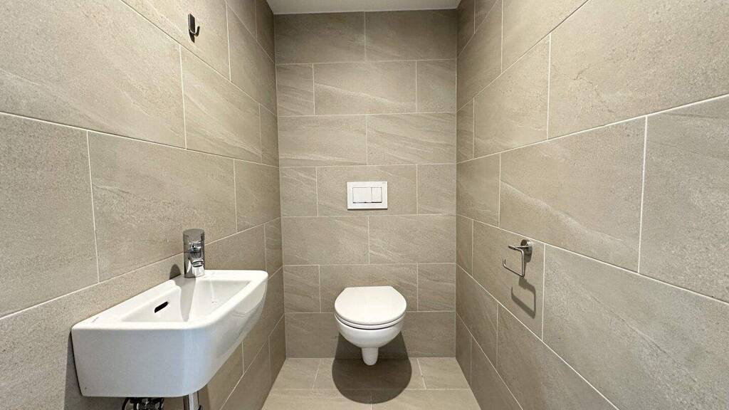 Der Wohnbereich verfügt über Eichenholzparkettboden, im Bad und den meist separaten WCs mit Waschbecken befinden sich moderne Steinfliesen.