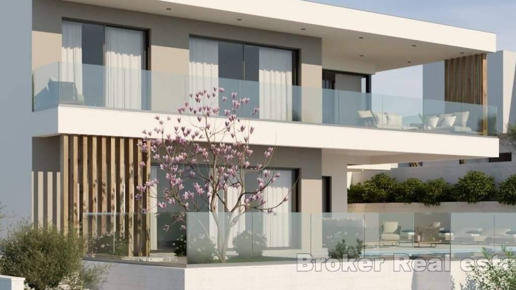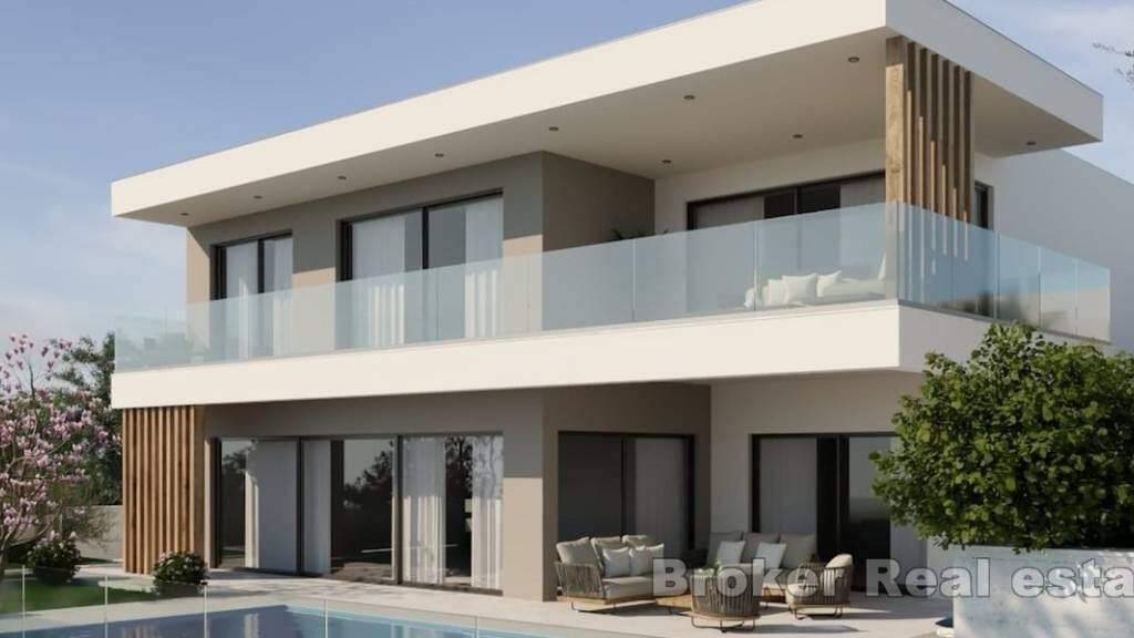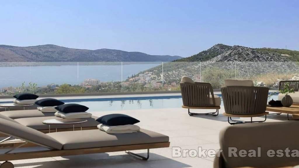 Eine zum Verkauf stehende Villa befindet sich in einem ruhigen Dorf in der Nähe von Trogir und stellt eine Top-Immobilie mit modernem Design mit einer Gesamtfläche von 456 m auf einem Grundstück von ca. 640 m dar. Jedes Detail dieser Villa wurde sorgfältig entworfen, um Komfort, Funktionalität und Luxus zu bieten.