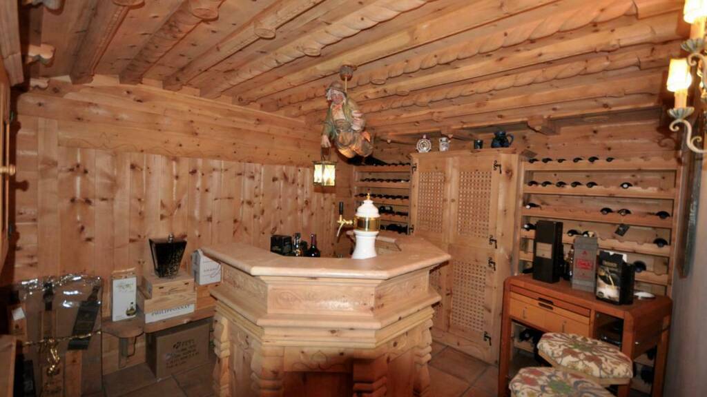 The basement of the villa is dedicated to relaxation and leisure, with an exclusive wellness area equipped with a glazed sauna, a Turkish bath, a whirlpool for six people and an experience shower, as well as an adjacent gym. On the same level, in addition to a practical laundry room, there is a magnificent tavern with fireplace, characterized by wood paneling and wooden ceiling tiles handmade by local artisans, and a characteristic cellar for storing wines, completely covered with carved pine wood and equipped with a bar and tap for beer and wine.