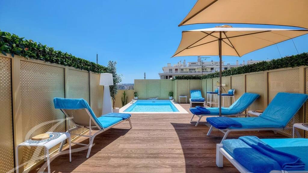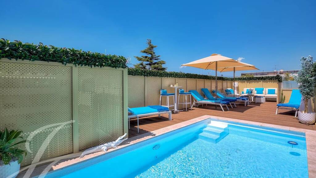 In einer luxuriösen Residenz, 2. Reihe von La Croisette, wunderschöne moderne Wohnung von 100 m2 mit einer Dachterrasse von 176 m2 mit privatem Pool (5,5m x 3m), Liegestühlen, Wohnzimmer, Essbereich und Sommerküche mit BBQ.