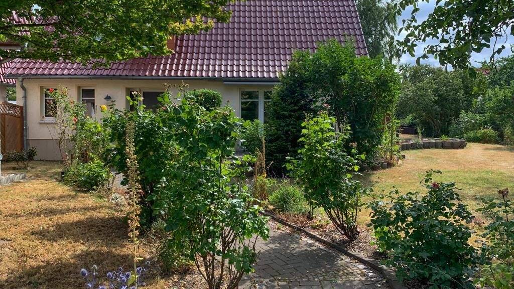 Der Garten ist geprägt durch große Rasenflächen, einige große Bäume, Koniferen, Sträucher und Rosen. Die Terrassenflächen wurden mit Pflanzsteinen begrenzt. Die Gestaltung der großen Terrasse wurde noch nicht abgeschlossen und lässt damit noch Spielraum für eigene Ideen. Im hinteren Teil des Grundstücks steht ein Gartenhaus, das vielseitig als Unterstellmöglichkeit genutzt werden kann.