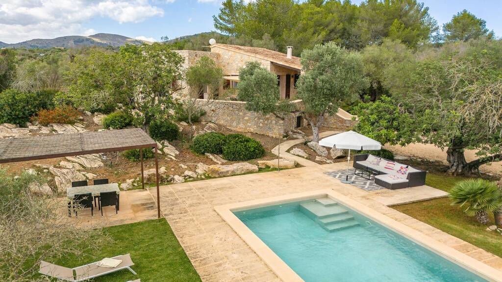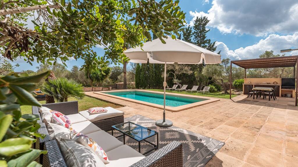 Die charmante Finca ist umgeben von einem großen Garten und bietet daher viel Privatsphäre. Ein Pool mit Terrasse, Grill und Essbereich im Freien runden den Außenbereich ab. Auf der oberen Terrasse neben dem Haus gibt es weitere gemütliche Plätze zum Essen und Entspannen und arbeiten.