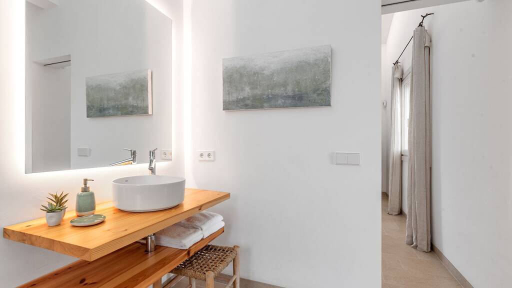 Im Inneren der Finca erwartet Sie eine helle und offene Atmosphäre. Die hochwertigen Möbel, die natürlichen Materialien und das viele Tageslicht schaffen ein echtes mediterranes Wohngefühl. Die offene Küche ist elegant und dezent gestaltet und fügt sich harmonisch in den Wohnbereich ein. Der klare Stil mit natürlichen Farben setzt sich in den beiden Bädern und den beiden Schlafzimmern fort, sodass überall die Nähe zum Meer spürbar ist. Das perfekte Winterdomizil auf Mallorca zum entspannen als auch arbeiten!