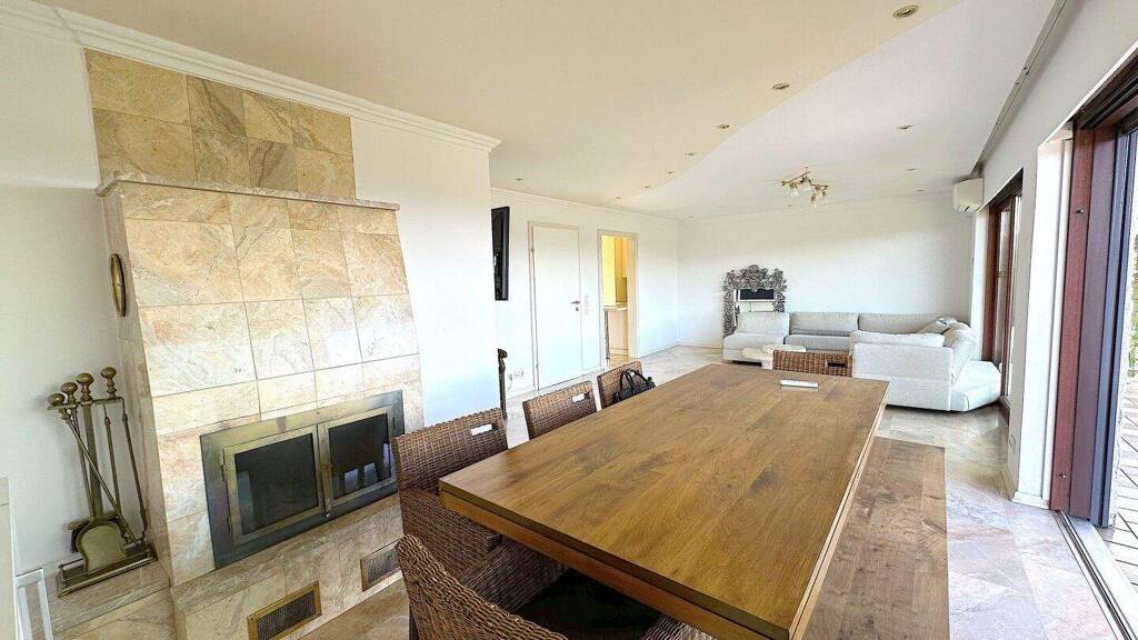 Lichtdurchflutetes Wohnzimmer mit Kamin, Klimaanlage und direktem Zugang zur oberen Terrasse mit traumhaftem Blick ins Grüne