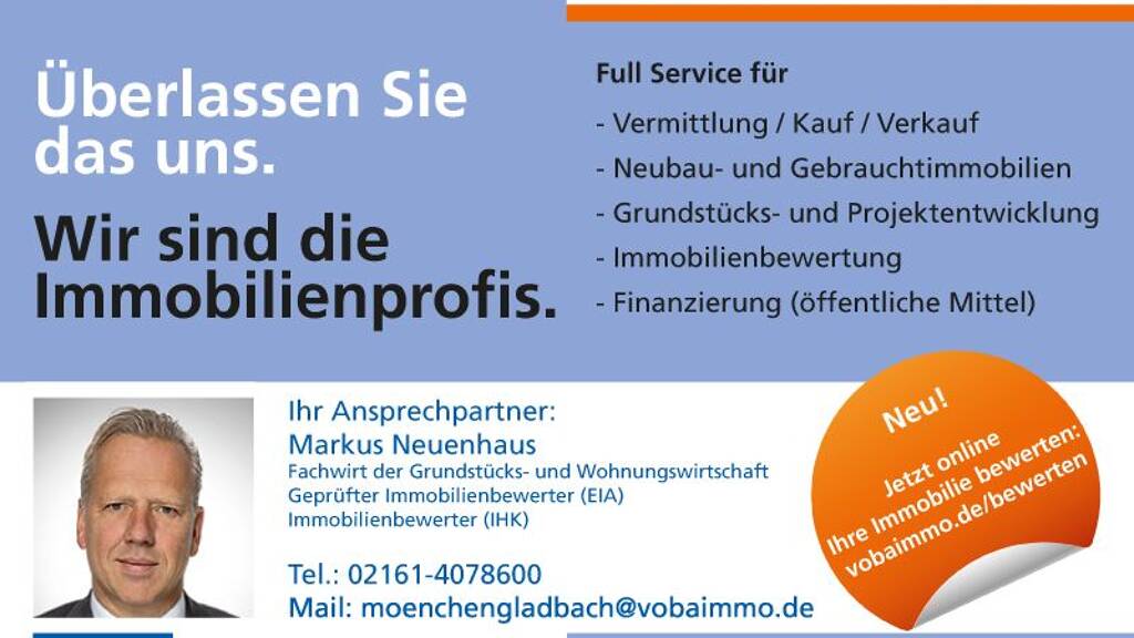Bis zum nächsten Autobahnanschluss sind es nur wenige Minuten. Darüber hinaus erreichen Sie mit öffentlichen Verkehrsmitteln die Innenstädte von Mönchengladbach bzw. Rheydt in kurzer Zeit.