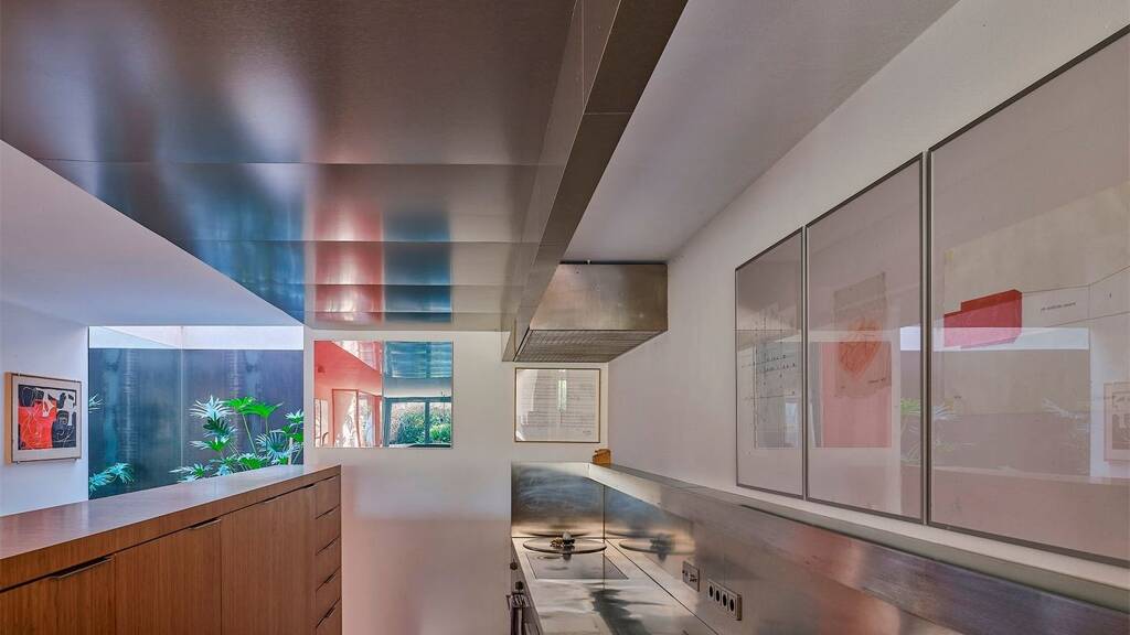 Die Küche ist elegant in den Wohnbereich integriert und kombiniert funktionale Edelstahlflächen mit maßgefertigten Einbauten. Durch einen eigenen Blick in den begrünten Lichthof entsteht eine helle Arbeitsatmosphäre mit zusätzlichem Raumgefühl.