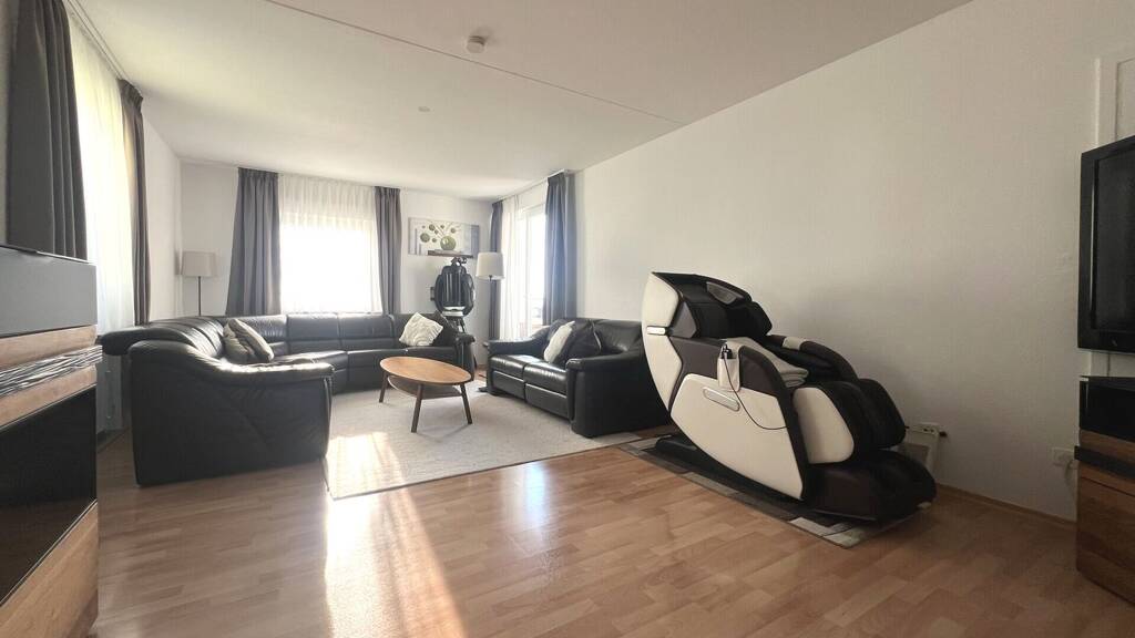 Diese großzügig geschnittene Etagenwohnung befindet sich im 4. OG eines Mehrfamilienhauses und besticht mit ihren ca. 128m² Wohnfläche durch viel Platz und Raum für Ihrer Familie oder für eine große Wohngemeinschaft! Es stehen Ihnen zwei moderne, mit hellen Fliesen ausgestattete Badezimmer sowie zwei überdachte Balkone (Süd- und Westbalkon) mit einem schönen Weitblick zur Verfügung. Ein Waschmaschinenanschluss befindet sich im großen Bad. Die mitvermietete Einbauküche mit den üblichen Einbaugeräten lädt zum gemütlichen Kochen ein. Die weißen Innentüren im Landhausstil bieten eine wohnliche Atmosphäre. Der im Flur eingebaute Schrank bietet Ihnen viel Stauraum. Die Außenrollläden geben Ihnen die Möglichkeit die Räumlichkeiten abzudunkeln. Zur Wohnung gehören zudem ein Kellerraum sowie ein Kfz-Stellplatz im Freien. Zusätzlich gibt es einen gemeinschaftlichen Waschraum mit Waschautomaten, einen Trockenraum sowie einen Fahrradabstellraum.