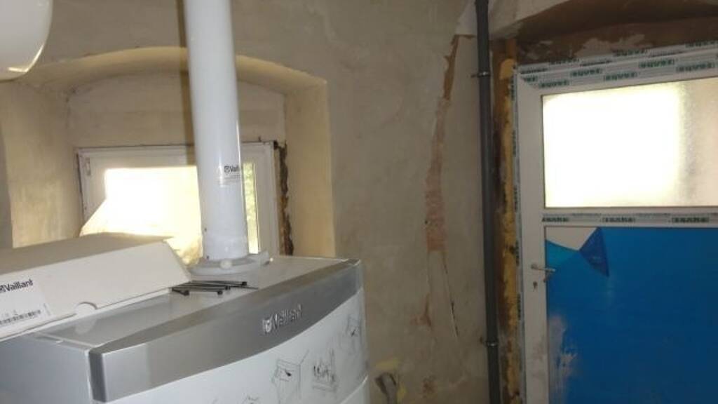 Es gibt noch unsanierte Bereiche, wie z.B. die Wand- und Deckenbeläge im Heizraum und einen benachbarten Raum (Stromkasten, WC, Waschbecken).