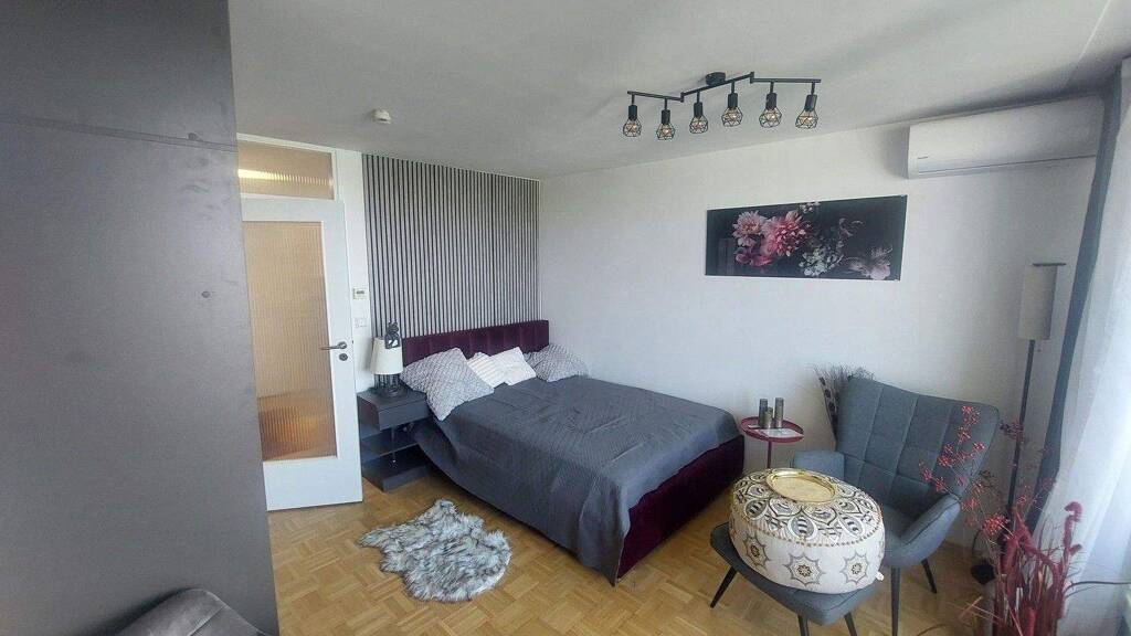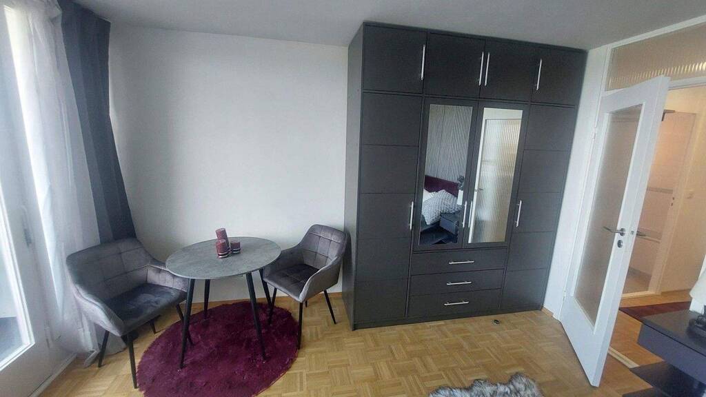 Dieses frisch sanierte 1-Zimmer-Apartment besticht durch seine moderne Ausstattung und stilvolle Möblierung. Der offene Wohnbereich bietet ausreichend Platz zum Wohnen und Arbeiten. Große Fenster lassen viel Tageslicht herein und öffnen den Blick auf den Westbalkon, von dem Sie einen beeindruckenden Panoramablick genießen können - perfekt für entspannte Abende.
