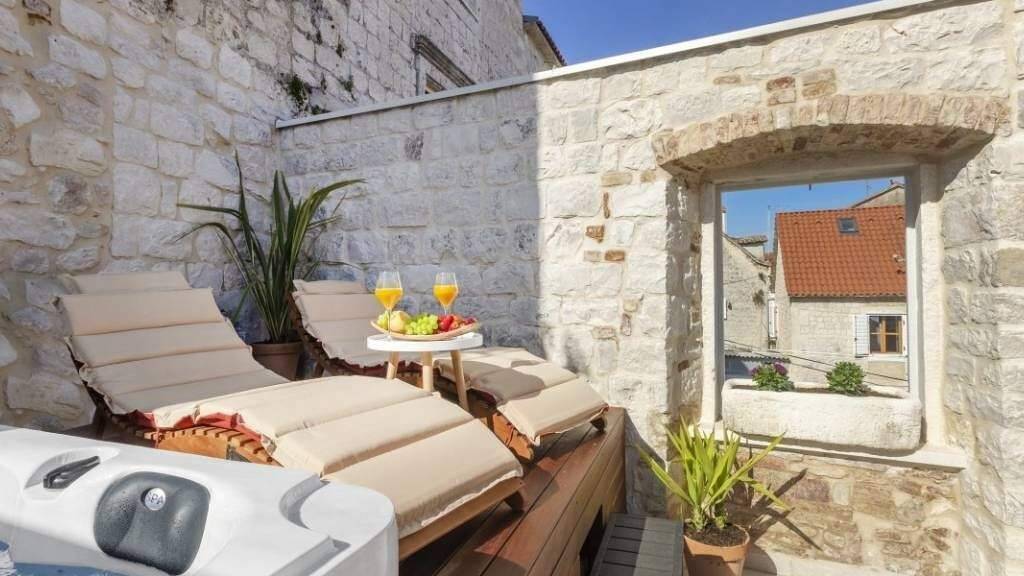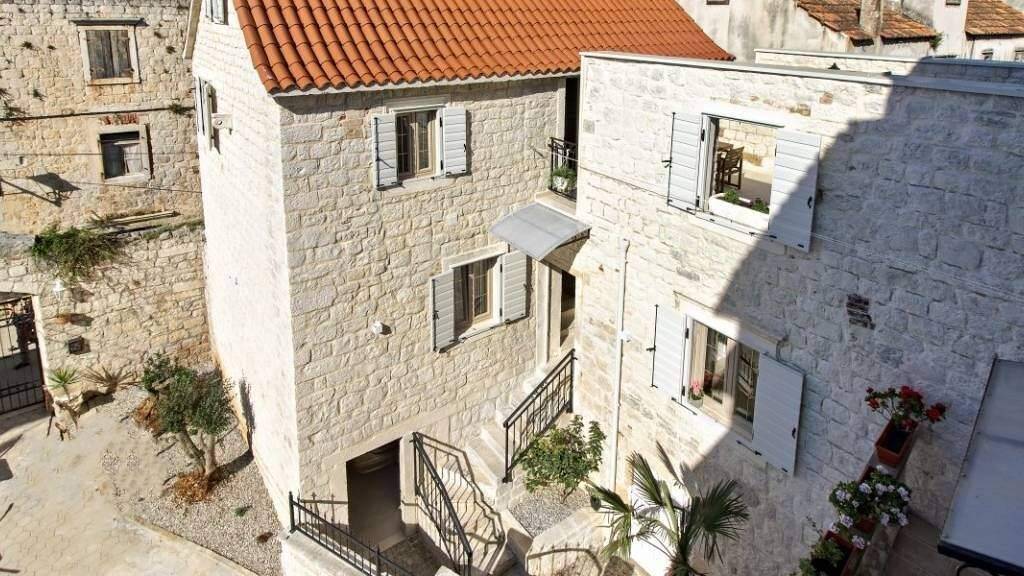 Zum Verkauf steht ein authentisches Steinhaus mit modernem Design, das sich in der Nähe des Zentrums von Trogir befindet. Das Haus erstreckt sich über 185 m auf drei Etagen und ist nach Norden ausgerichtet.