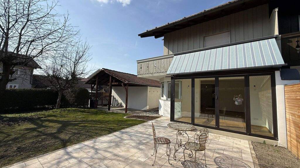 Dieses charmante Reihenendhaus aus dem Baujahr 1985 wurde in 2025 kernsaniert und mit hochwertigen Materialien ausgestattet. Das Haus überzeugt durch seine großzügige Raumaufteilung, die Komfort, Lebensqualität und besonderes Wohnambiente versprechen. Die 120 m² Wohnfläche verteilen sich über drei Etagen. Beim Betreten empfängt Sie ein großzügiger Dielenbereich. Von dort gelangen Sie in den lichtdurchfluteten Wohn-Essbereich mit angrenzendem verglasten Wintergarten und Zugang zum Garten. In diesem Bereich besteht die Möglichkeit einen Kaminofen anzuschließen. Neben einem Gäste WC befindet sich die exclusive Einbauküche mit allen elektrischen Geräten incl. Bora Induktionskochfeld. Im Obergeschoss befinden sich zwei Schlafzimmer mit Zugang auf den umlaufenden, überdachten Balkon und schöner Bergsicht. Das barrierefreie Bad ist mit einer großen Dusche, Waschbecken und WC ausgestattet. Villeroy & Boch Armaturen und Mosaikfliesen unterstreichen hier die hochwertige Ausstattung. Das neu gestaltete Dachgeschoss mit Einbauschränken, zusätzlichem Stauraum, einem Bad und einem weiteren, großzügigen Zimmer runden die Wohnfläche ab. Im Untergeschoss wurde der 20² große Raum ebenfalls mit einer Fußbodenheizung ausgestattet und bietet sich daher zur individuellen Nutzung an. Weiterhin befinden sich ein Wirtschaftsraum mit Anschlüssen für Waschmaschine und Trockner, Technik und ein Vorratskeller im Untergeschoss. Ausgestattet wurde das Haus mit modernen und hochwertigen Materialien, Eichendielen, italienischer Mamor und Naturstein. Der großzügige Garten wurde neu angelegt mit einer 20m² großen Terrasse in Naturstein/Travertin , Pflanzbeeten, überdachten Freisitz und Rasenbereich. Zum Haus gehören eine Einzelgarage und zwei Stellplätze.