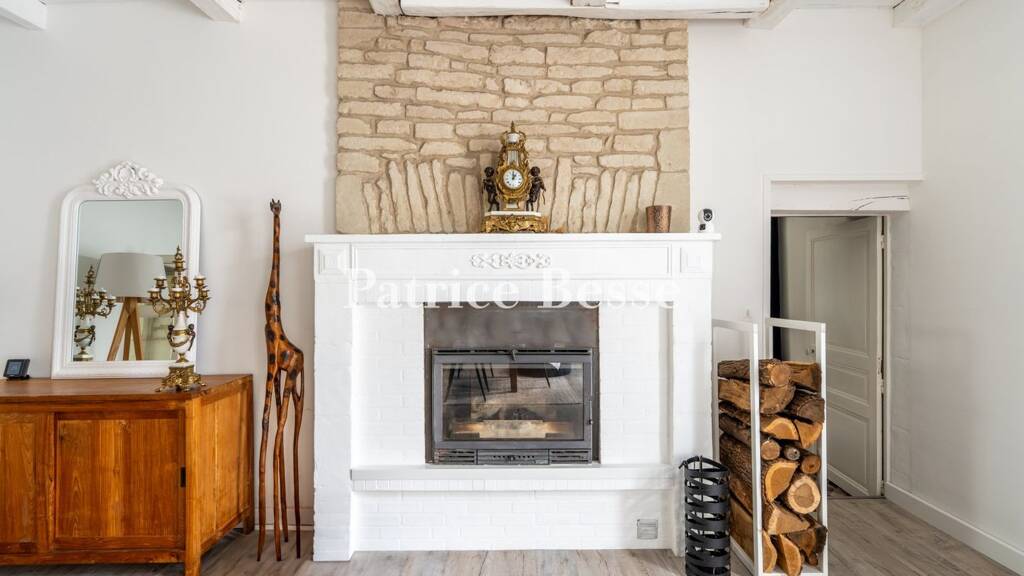 The glazed front door opens on to a hallway with a floor of cement tiles. This hall connects to a bathroom, a separate lavatory and a space with a fireplace that is currently separated with openwork panels but which could easily become a bedroom. From the entrance hall, a door leads to a dining room, which connects to a kitchen and a lounge. A door takes you outside. The dining room has sprung wood flooring and the sculpted stone and painted brick fireplace houses an insert. The room connects to a lounge, with a stone slab floor, bathed in natural light from garden-facing windows. This lounge also has a fireplace, featuring the same materials as the dining room, which has also been fitted with an insert. Next, there is an office. It has an open-hearth fireplace and a floor of stone slabs. The room leads to a scullery, which adjoins the kitchen. This kitchen has large windows that look out at the other part of the garden and the orchard. The walls are made of exposed stonework and square terracotta tiles adorn the floor. A door leads to a boiler room and linen room.