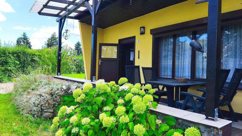 Das Bungalow ist ein Doppelhaus, welches auf Pachtland errichtet wurde. Das Grundstück wird daher mit den Nachbar geteilt. Die Wohnfläche von 35 m² verteilt sich auf das Wohnzimmer mit Kamin, ein kleines Schlafzimmer mit zwei Betten, eine funktionale Küche mit allen Geräten sowie das Tageslichtbad mit Dusche. Es gibt zwei Terrassen: eine überdachte Terrasse mit Süd-Ausrichtung und eine Morgen-Terrasse mit Ost-Sonne. Alle Medien sind vorhanden: Abwasser erfolgt über eine Sammelgrube, Fernsehempfang mit SAT-Schüssel.