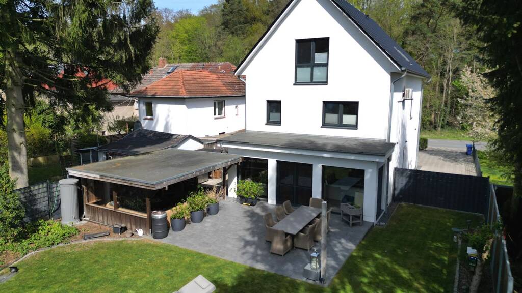 Diese Luxusimmobilie wurde im Jahr 2015 auf einem ca. 1.200 m² großen Grundstück in der Gartenstadt, einer sehr begehrten Wohngegend der Hanse- und Universitätsstadt Rostock, neu erbaut. Die großzügige Wohnfläche von ca. 232 m² verteilt sich auf 3 Ebenen. Über den sehr geräumigen Eingangsbereich im Erdgeschoss mit einem schönen Garderobenbereich und eigenem Schuhzimmer gelangt man in den eleganten und lichtdurchfluteten offenen Wohn-, Küchen- und Essbereich, welcher mit einer hochwertigen Küche mit Mitteltresen und einem gemütlichen Kamin ausgestattet ist. Komplettiert wird das Angebot durch die bodentiefen Fenster mit elektrischen Außenjalousien, die eine ideale Aussicht auf die Terrasse sowie dem liebevoll angelegten Grundstück bieten. Ebenfalls im Erdgeschoss befindet sich das Gäste-WC und der Hauswirtschaftsraum mit einem Zugang zum Garten-/Terrassenbereich. Eine wunderschöne Massivholztreppe führt in das Obergeschoß zu einem Master-Schlafzimmer mit angrenzendem Ankleidezimmer und edlen Einbauschränken und einem weiteren Schlaf- oder Arbeitszimmer. Das exklusive und große Vollbad verfügt über eine ebenerdige Regendusche, eine Badewanne und einen Doppelwaschtisch. Die Böden und Wände sind mit geschmackvollen und großformatigen Fliesen ausgestattet. Ein zusätzliches Ausstattungshighlight ist die Sauna, die diesen Ort zu einer Wohlfühloase werden lässt. Auf der dritten Ebene des Hauses im Dachgeschoß vervollständigen zwei weitere Zimmer für individuelle Nutzungsmöglichkeiten mit einem Duschbad und angrenzendem Ankleidezimmer das Raumangebot. Die Schlafzimmer des Hauses sind mit einer Klimaanlage und alle Fenster mit Plissees ausgestattet. Ein Doppelcarport und zwei Außenstellplätze bieten ausreichend Platz für PKWs. Der beeindruckende Gartenbereich verfügt über eine riesige, zum Teil überdachte Terrasse mit viel Platz zum Erholen, Kochen, Essen und für gemütliche Abende unter dem Sternenhimmel. Fern ab von dem Trubel des Alltäglichen unvergessliche Momente erleben, ist hier ein Garant. Der Garten verfügt über schön angelegte Beete und aufwändige Bepflanzungen. Ganz nach den individuellen Wünschen und Bedürfnissen, lässt sich das Grundstück mit einem Pool oder einer zusätzlichen Bebauung zwischen 80 m² - 150 m² laut vorliegendem B-Plan bebauen.