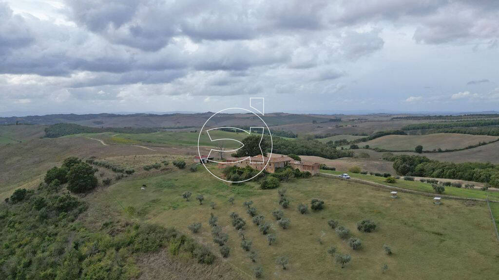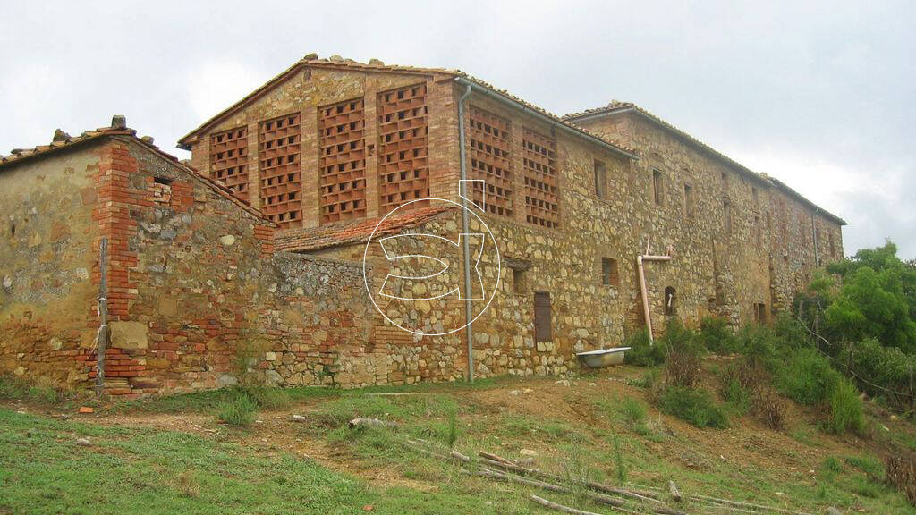 In der charakteristischen toskanischen Ortschaft San Giovanni d'Asso, in der Gemeinde Montalcino, in der Provinz Siena, steht dieses renovierungsbedürftige Anwesen, umgeben von ca. 96 Hektar Land.