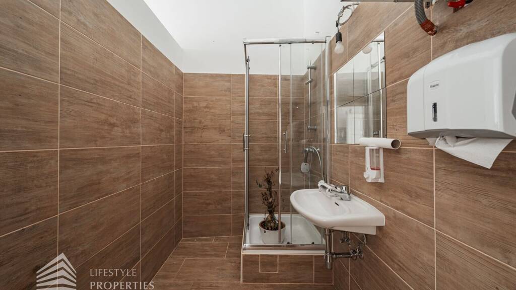Das geräumige Büro teilt sich auf in eine geräumige Garderobe, drei Zimmer, ein Badezimmer mit Dusche, ein Zimmer mit Küchenanschluss und drei separate WC´s. Sie betreten die Büroräumlichkeiten und stehen im geräumigen Vorraum. Neben Ihnen befindet sich die Toilette. Danach gelangen Sie über die Garderobe in ein geräumiges, verfliestes Zimmer, welches über einen Küchenanschluss verfügt. Daneben treffen Sie auf das Badezimmer, welches über eine Dusche und ein kleines Waschbecken verfügt. Zurück im Vorraum, wenn Sie gerade aus weitergehen, kommen Sie auch schon in das erste Zimmer. Durch die vielen, großen Fenster ist der Raum angenehm lichtdurchflutet und wirkt dadurch sehr einladend. Das nächste Zimmer ist ähnlich wie das erste Zimmer gestaltet und wirkt ebenfalls sehr hell und freundlich. Der letzte Büroraum verfügt außerdem über ein kleines Waschbecken.