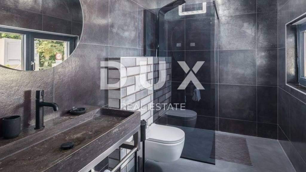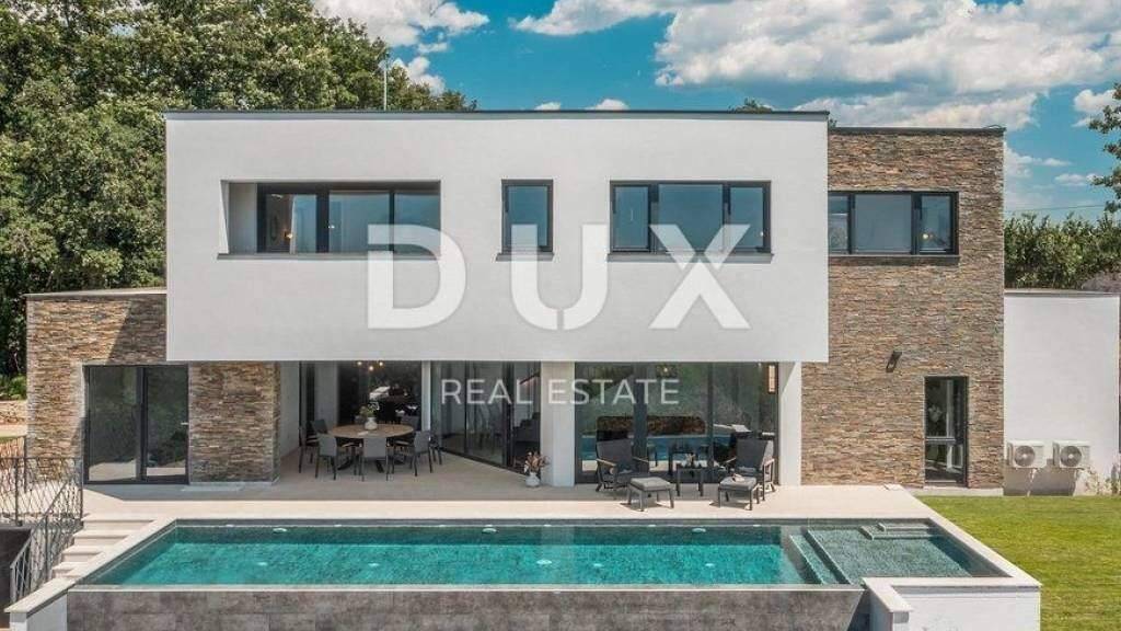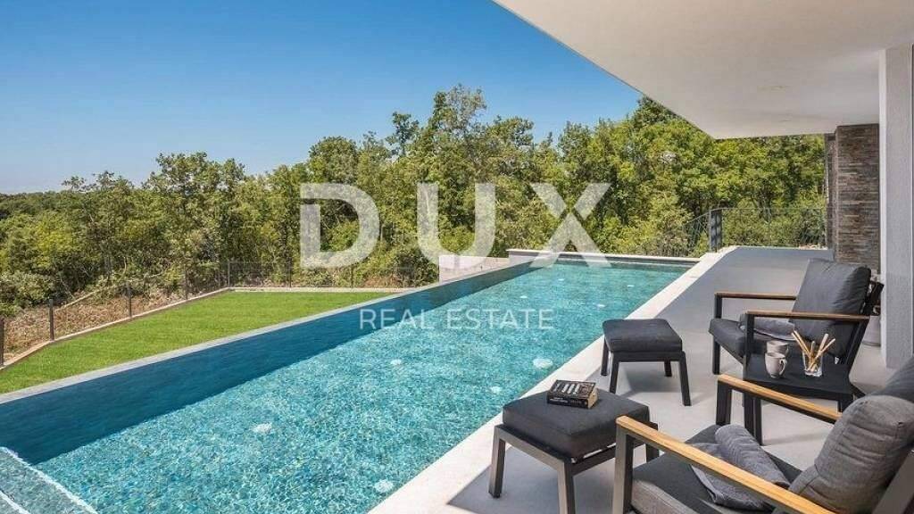 Die mittelalterliche Stadt Buje liegt im nordwestlichen Teil der istrischen Halbinsel auf einem Hügel mit herrlichem Blick auf das Meer, die umliegenden Hügel, Weinberge und Olivenhaine, für die diese Gegend bekannt ist. Die Nähe zum Meer, der Einfluss des mediterranen und milden kontinentalen Klimas, die Tradition in Landwirtschaft, Jagd und Tourismus, die hügelige Landschaft sowie die unberührte Natur machen Buje zu einer der attraktivsten Gegenden der istrischen Halbinsel. Die moderne Villa mit Swimmingpool befindet sich in ruhiger Lage in der Nähe von Buje, umgeben von unberührter Natur. Die Villa vereint moderne Architektur perfekt mit traditionellen Steinelementen, die in der Fassade verwendet wurden. Die Villa erstreckt sich über zwei Etagen und bietet puren Luxus. Die Innenräume sind mit Kunstwerken akademischer Maler dekoriert, die Badezimmer sind mit hochwertiger Keramik renommierter Hersteller ausgestattet. Der überdachte Außeneingang führt zur Eingangshalle, die in den offenen Wohnbereich der Villa übergeht. Die moderne und voll ausgestattete Küche mit Essbereich und das geräumige Wohnzimmer sind durch große Glaswände mit dem Außenbereich der Villa verbunden. Auf der teilweise überdachten Außenterrasse befindet sich ein Esszimmer, und in der Verlängerung der Terrasse befindet sich ein Infinity-Pool, umgeben von einer Liegewiese. Auf derselben Etage befinden sich ein Abstellraum, eine Garderobe und eine Toilette. Ein zusätzlicher Raum kann als Wellnessraum eingerichtet werden. Eine schöne Innentreppe führt in den ersten Stock der Villa, wo sich drei Schlafzimmer befinden. Alle Zimmer haben ein eigenes Bad, während zwei Zimmer über begehbare Kleiderschränke verfügen. Der Hauptraum verfügt außerdem über eine Loggia. Teil des Flachdachs sind zwei geräumige Dachterrassen mit Panoramablick auf die Umgebung. Die Heizung erfolgt über Wärmepumpen, die Kühlung über Klimaanlagen. Es wurden Vorbereitungen für eine Fußbodenheizung getroffen. Der Innenhof der Villa ist im mediterranen Stil gestaltet und verfügt über einen Außenparkplatz. Beim Bau und der Einrichtung der Villa wurden ausschließlich hochwertige Materialien namhafter Hersteller verwendet. Sehr geehrte Kunden, die Agenturprovision wird gemäß den Allgemeinen Geschäftsbedingungen www.dux-nekretnine.hr/opci-uvjeti-poslovanja berechnet