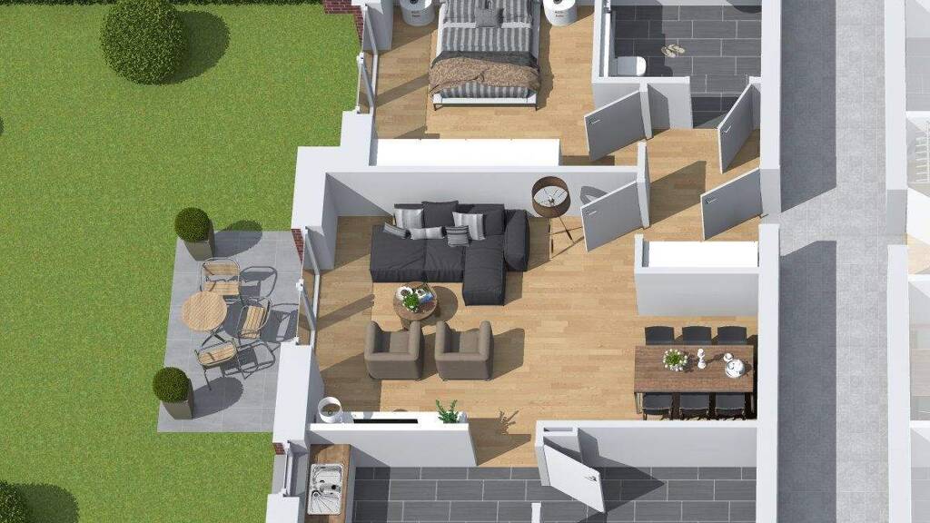 Diese moderne Erdgeschosswohnung befindet sich in einem Neubau mit insgesamt drei Etagen und ist ab dem 1. Mai 2026 verfügbar. Mit einer Wohnfläche von 68,45 m² bietet sie zwei Zimmer, darunter ein Schlafzimmer und ein Badezimmer mit Dusche. Die Wohnung wird im Erstbezug übergeben.