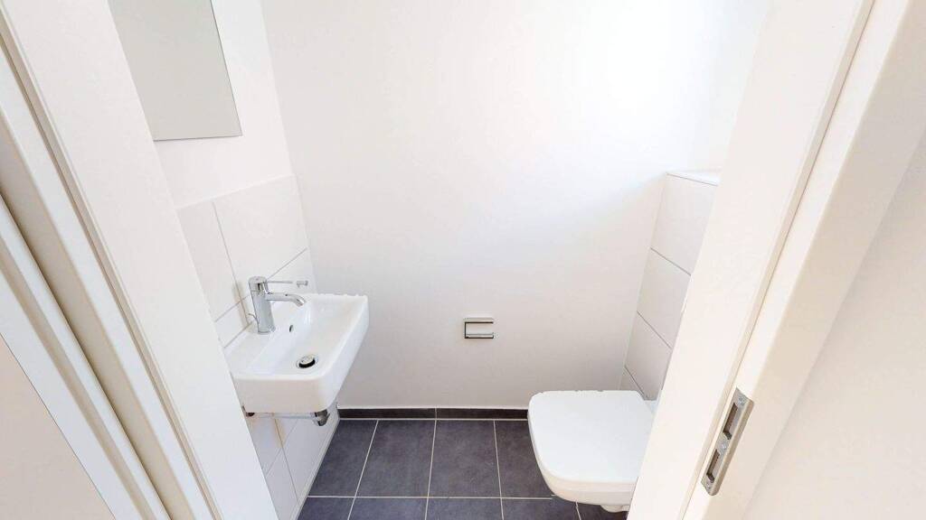 - Parkett in den Wohnbereichen und moderne Fliesen in den Bädern und im