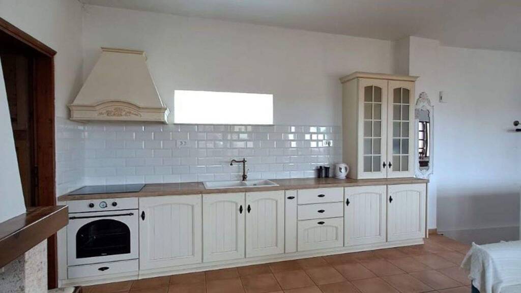 Die neu renovierte Küche verfügt über einen integrierten Kühlschrank, einen Gefrierschrank, einen Backofen, ein Kochfeld und eine externe Dunstabzugshaube. Gegenüber dem Badezimmer befindet sich ein vom Boden bis zur Decke reichender Vorratsraum mit tiefen Regalen. Der Essbereich verfügt über eine eingebaute Sitzecke und ein geräumiges Wohnzimmer mit einem geschlossenen Kamin und einer großen Glastür.