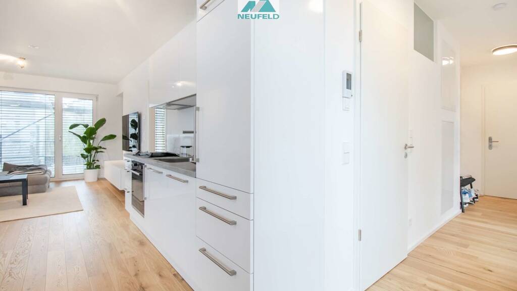 Der offen gestaltete Küchenbereich ist ein Highlight für alle, die Wert auf Qualität legen: Ausgestattet mit hochwertigen Markengeräten von Bosch und Blanco, bietet die Küche nicht nur stilvolle Optik, sondern auch Funktionalität - ideal für Genießer und Kochbegeisterte.
