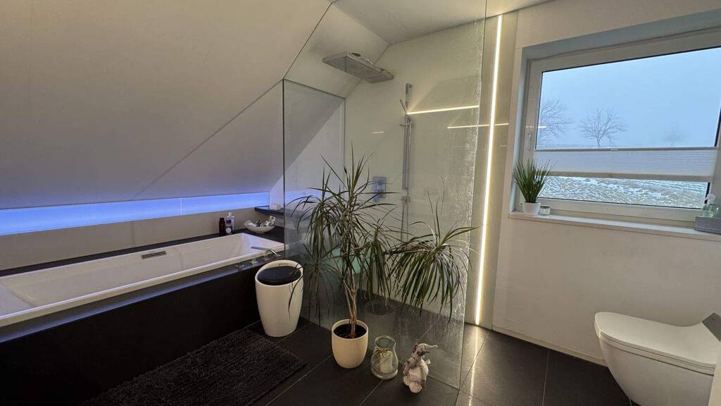 Die zweite Wohneinheit befindet sich im Dachgeschoss und bietet ca. 78 m² Wohnfläche. Sie verfügt ebenfalls über drei Zimmer, ein hochwertig ausgestattetes Badezimmer sowie eine offen gestaltete Küche. Ergänzend steht ein ausgebautes Dachgeschoss zur Verfügung, das sich ideal als Rückzugsbereich, zur Entspannung oder für Hobby- und Freizeitnutzung eignet.