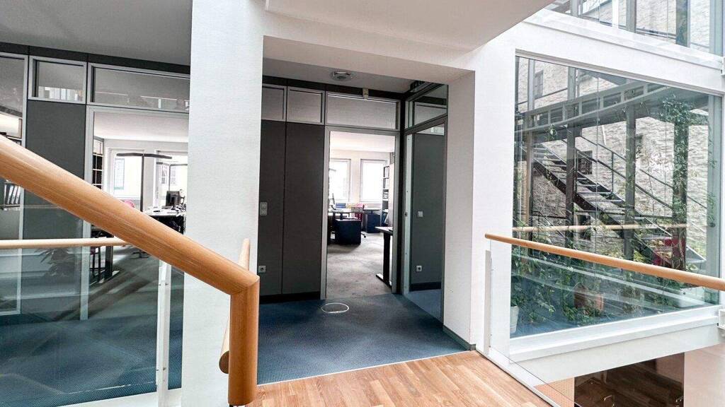 Das Bürohaus erstreckt sich über vier Etagen und umfasst eine Gesamtnutzfläche von ca. 972 m², die sich flexibel nutzen lässt. Ein weitläufiges, lichtdurchflutetes Foyer bildet den Eingangsbereich des Gebäudes und schafft eine beeindruckende Atmosphäre.