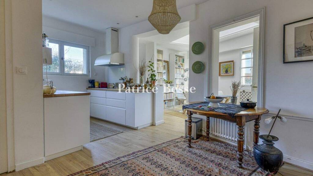 Designed in the Haussmannian style, the villa's builder clearly intended to pay homage to his Parisian flat by reproducing it here. The large, arched front door, made out of iron and glass, opens onto a foyer with a travertine stone floor, which then leads to a hallway with a narrow plank oak floor and brown ochre painted walls that gracefully contrast with its white rectangular-moulded wainscoting. On one side, the living area include a dining room and an adjacent sitting room for a total of almost 40 m², the décor of which has been carefully conserved, such as mitred herringbone hardwood floors, wainscoting or floor-to-ceiling wood panelling, a white marble fireplace topped with a mirrored chimneybreast as well as finely-crafted friezes, crown moulding, cornices and ceiling roses. With white walls and ceilings that highlight the rooms' overall luminosity, the sculpted plasterworks in this space create a décor composed of geometrical motifs, fruit garlands and flowers as well as mythological scenes, while wide, large-paned glass doors face south and provide exceptional views of the ornamental garden. On the other side of the hallway, a fitted kitchen communicates with another eating area with laminate flooring meant to resemble light oak hardwood and a skylight that provides overhead light, while two large picture windows look out onto the street. Behind this room, are two richly decorated bedrooms, the Haussmannian cachet of which is once again visible: original wood panelling, decorative ...