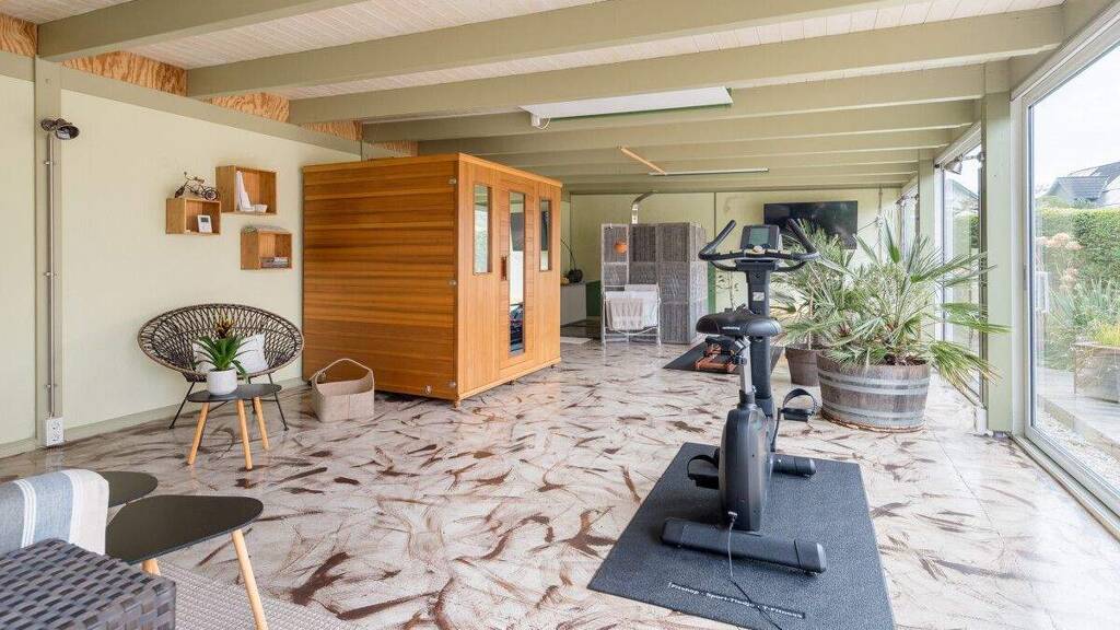 Abgerundet wird das stimmige Gesamtbild von einer überdachten Südterrasse mit dimmbarer Beleuchtung, einem Hauswirtschaftraum und einem Gäste-WC im Erdgeschoss sowie einem separat errichtetem Fitness- und Wellnessraum im Außenbereich inklusive Sauna und eigener Dusche. Das Haus verfügt außerdem über eine 2015 erneuerte Gasheizung, Glasfaseranschluss und elektrisch bedienbare Fensterläden aus Holz.