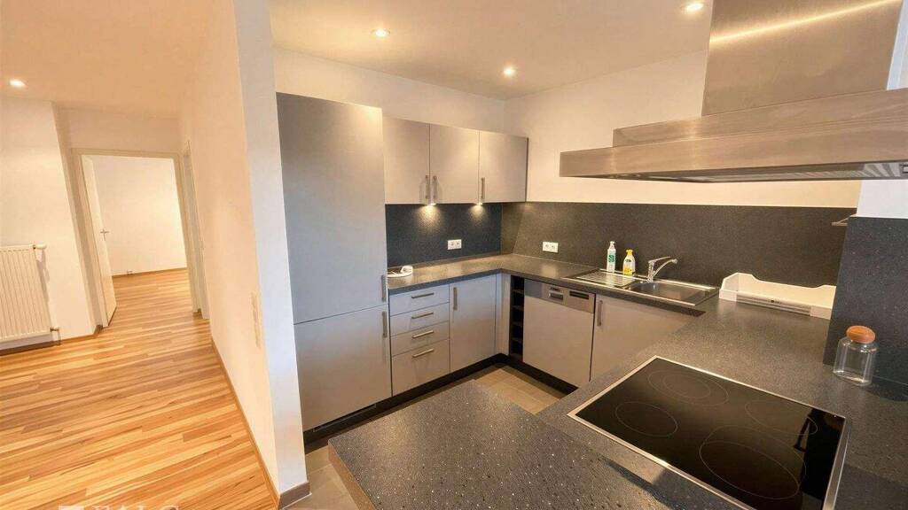 Die moderne Einbauküche fügt sich harmonisch in den Raum ein und gehört zur Wohnung.