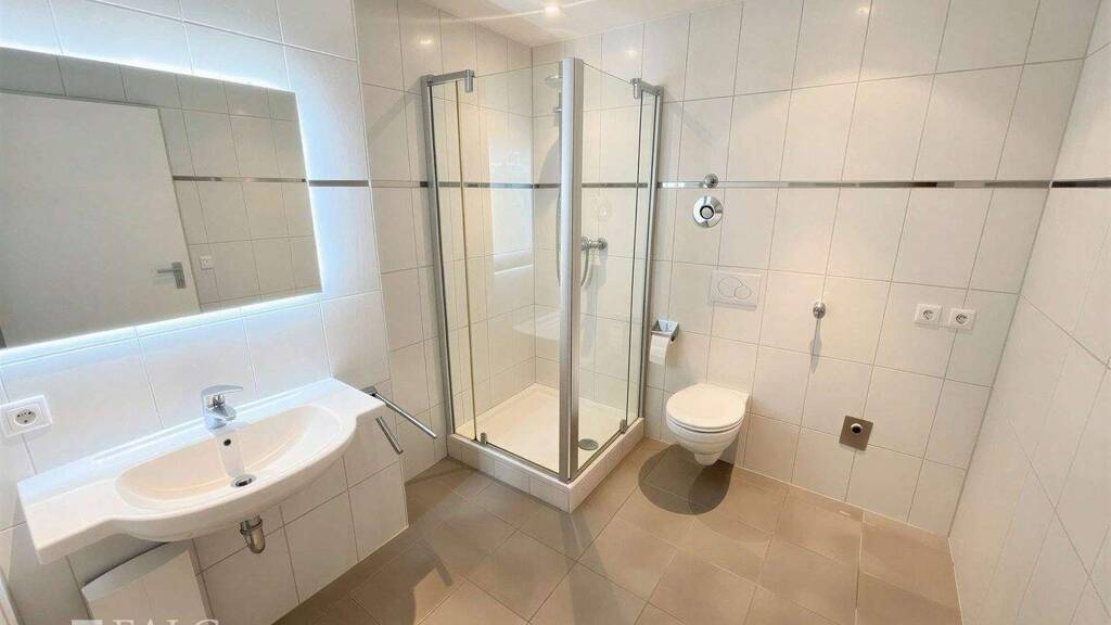 Geradeaus gelangen Sie in das modern gestaltete Badezimmer, das mit Dusche, Waschbecken, WC, Handtuchheizkörper sowie Stellflächen und Anschlüsse für Waschmaschine und Trockner überzeugt. Die zeitgemäße Ausstattung sorgt für hohen Alltagskomfort.