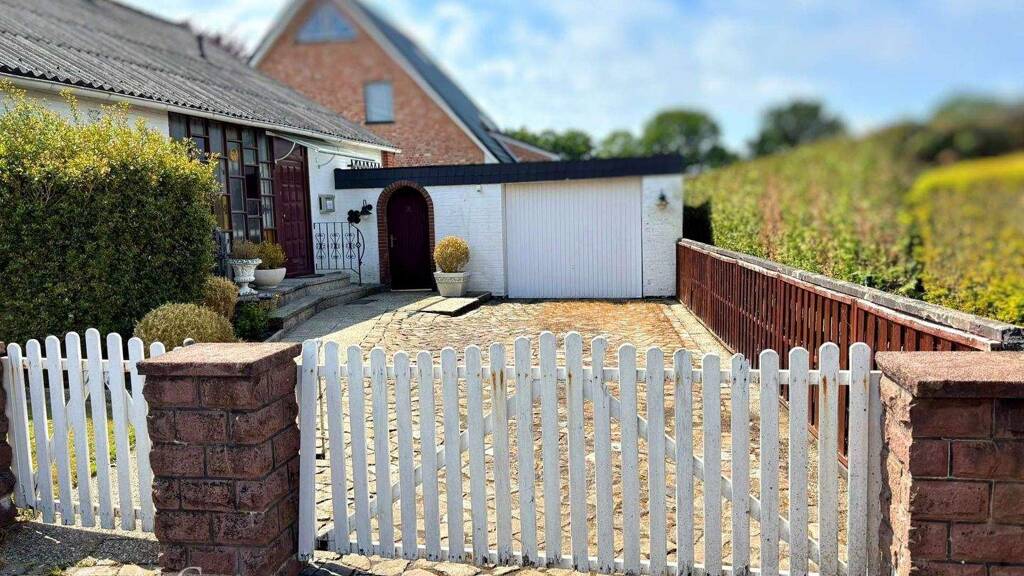 Der Außenbereich des Bungalows ist ebenso durchdacht: Die Terrasse, die vom Wohnzimmer aus zugänglich ist, bietet ausreichend Platz für einen Sitzbereich und ist der perfekte Ort für gemütliche Stunden im Freien. Der liebevoll gestaltete Garten, der sich um das Haus erstreckt, wird durch ein kleines Gartenhaus ergänzt und bietet Hobbygärtnern ausreichend Platz für kreative Ideen und Anbauflächen.
