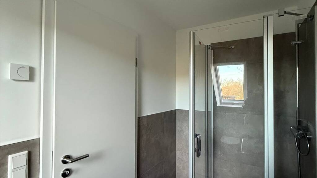Das Schlafzimmer liegt ruhig zur Hausrückseite, das Bad ist modern gestaltet und hochwertig ausgestattet.