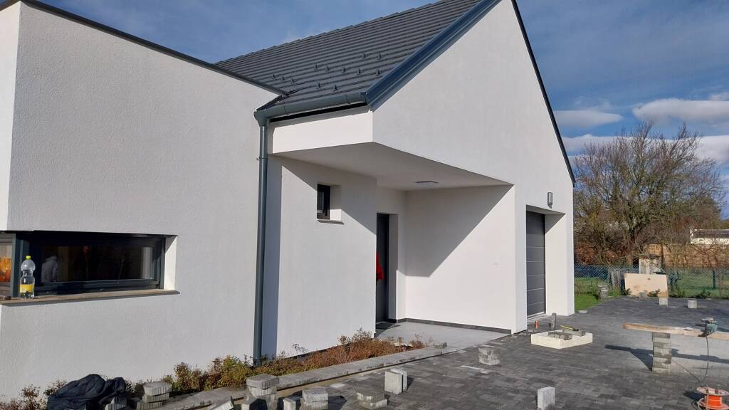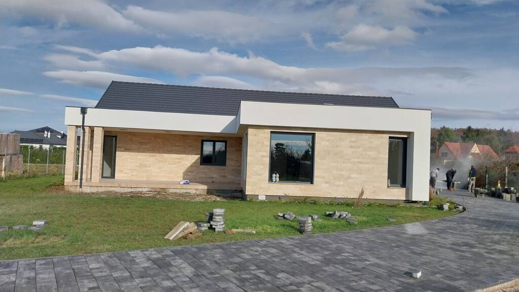 Der Hof ist grasbewachsen und von Ziersträuchern gesäumt. Derzeit sind noch die Pflasterung der Einfahrt und des Hinterhofs sowie der Bau eines überdachten Zweisitzer-Parkplatzes im Gange. Für den Bereich neben der überdachten Terrasse kann opcionális ein Swimmingpool bestellt werden.